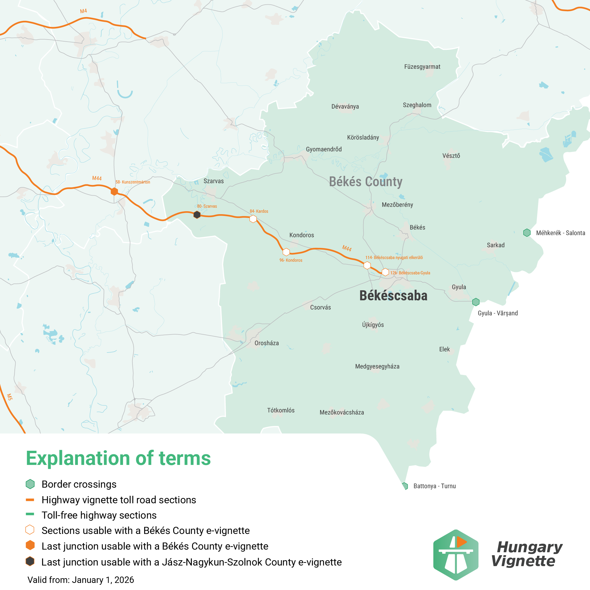 Автострада M44 діє з віньєткою Бекеш комітату від 118-го перехрестя Békéscsaba-Gyula до 50-го перехрестя Kunszentmárton. Якщо ви плануєте продовжувати їзду по M44 в сторону Кечкемету, вам знадобиться віньєтка комітату Jász-Nagykun-Szolnok або будь-яка інша національно дійсна (щоденна, тижнева, місячна або річна) автомагістральна віньєтка.