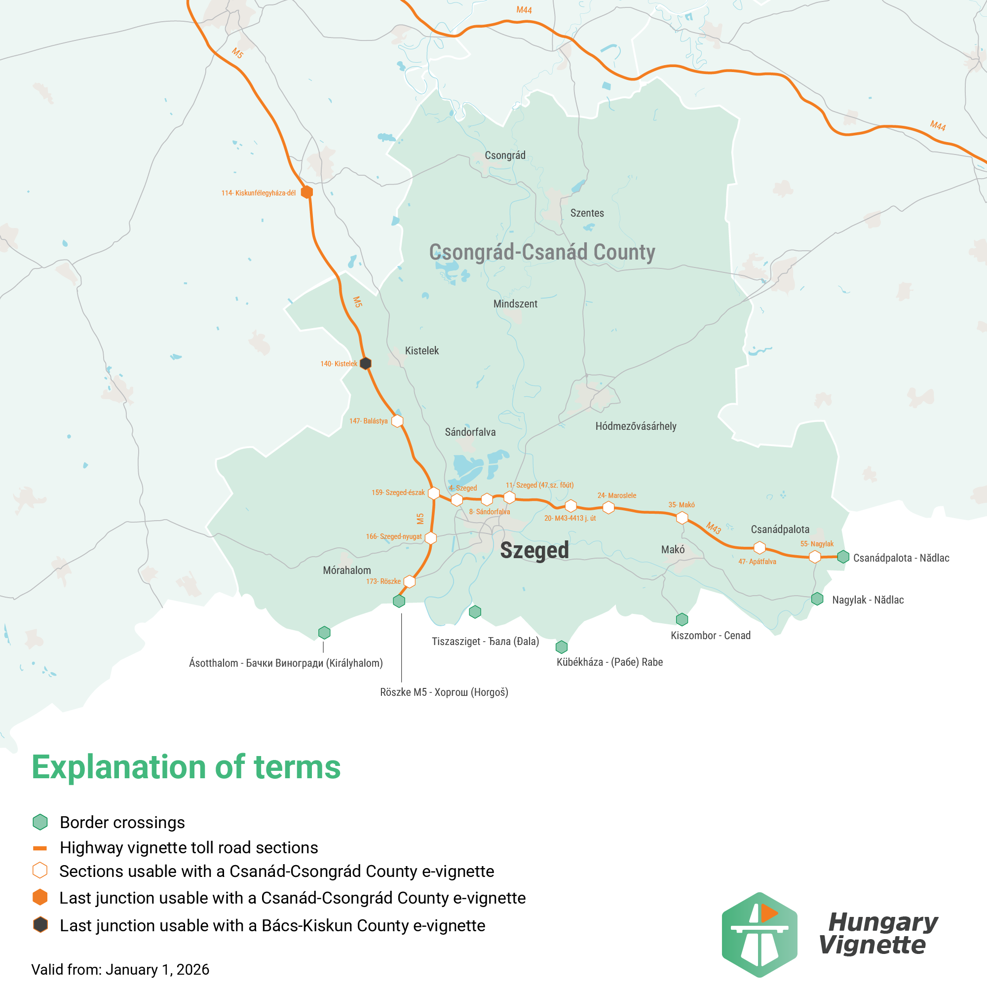 Чонград-Чанад розташований на південно-східній частині Угорщини, із Сегедом як його обласним центром. Автомагістраль М5 має ключове значення, оскільки вона забезпечує доступ до Сербії через прикордонний перехід Рьоске. Автомагістраль М43 веде до Румунії, що робить віньєтку автомагістралі Комітету Чонград-Чанад необхідною для транзитного трафіку. Віньєтка автомагістралі Чонград-Чанад необхідна для тих, хто регулярно подорожує в регіоні або проїздить через Комітет, оскільки основні маршрути тут є платними. Віньєтка автомагістралі Чонград-Чанад дозволяє користування платними дорогами в межах Комітета, сприяючи подорожам і транспортуванню.