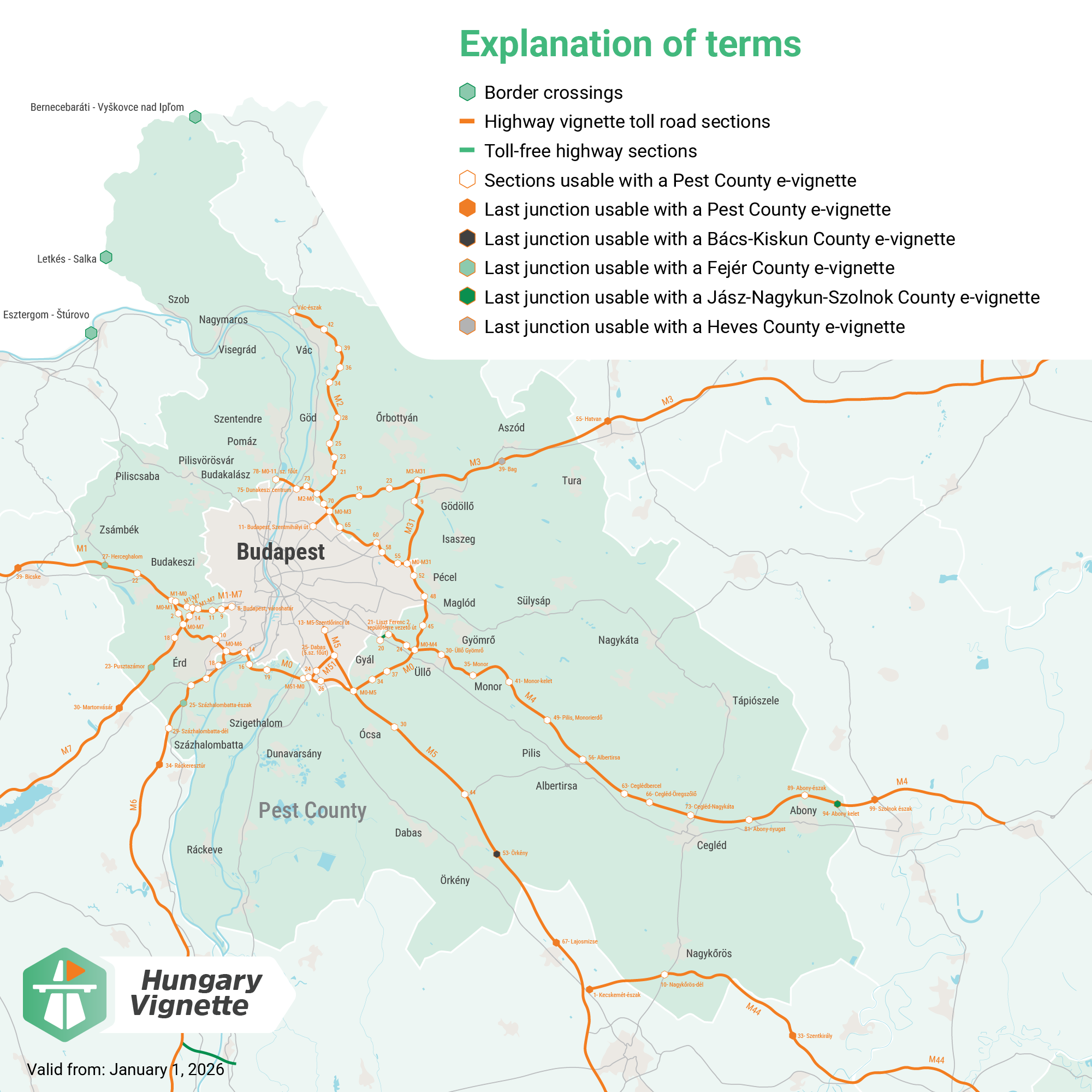 - Діє на всіх платних ділянках у Пештській області, а також на перших виїздах після кордону області.