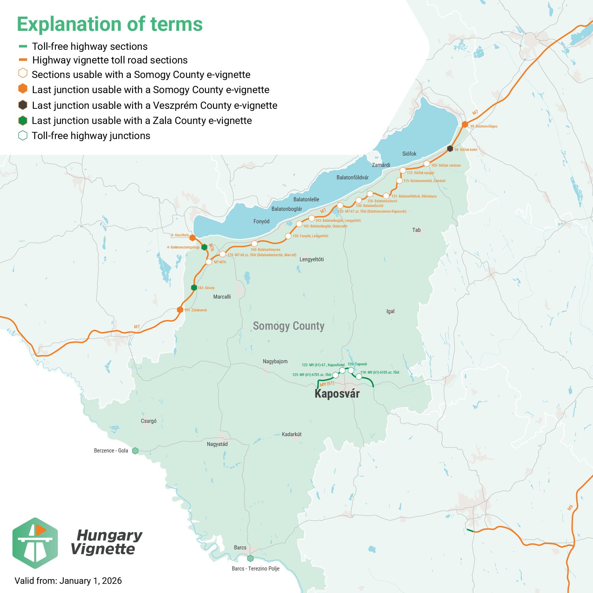 Автомагістраль M7 дійсна з віньєткою Шомодь від роз'їзду 90 у Балатонвілягоші до роз'їзду 191 у Залакомарі. Якщо продовжувати в напрямку до північного берега озера Балатон, можливо, вам знадобиться віньєтка Зала або Вешпрем або будь-яка інша національна автовіньєтка (щоденна, щотижнева, щомісячна або щорічна).