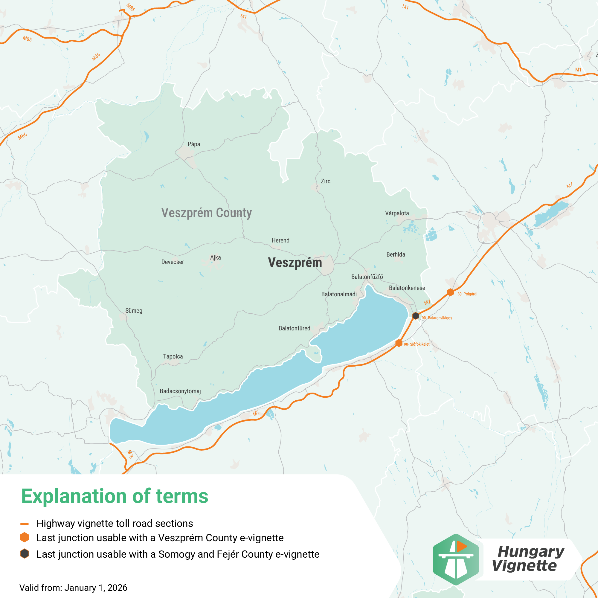 Шосе M7 діє з вайнеткою Веспремської області від розв'язки 80 при Полгарді до розв'язки 98 при Сіофокі Схід. Якщо продовжувати рух по M7 в напрямку до озера Балатон, може знадобитися вайнетка округи Сомоді або округи Зала або будь-яка інша національна вайнетка для автострад (щоденна, тижнева, місячна або річна).